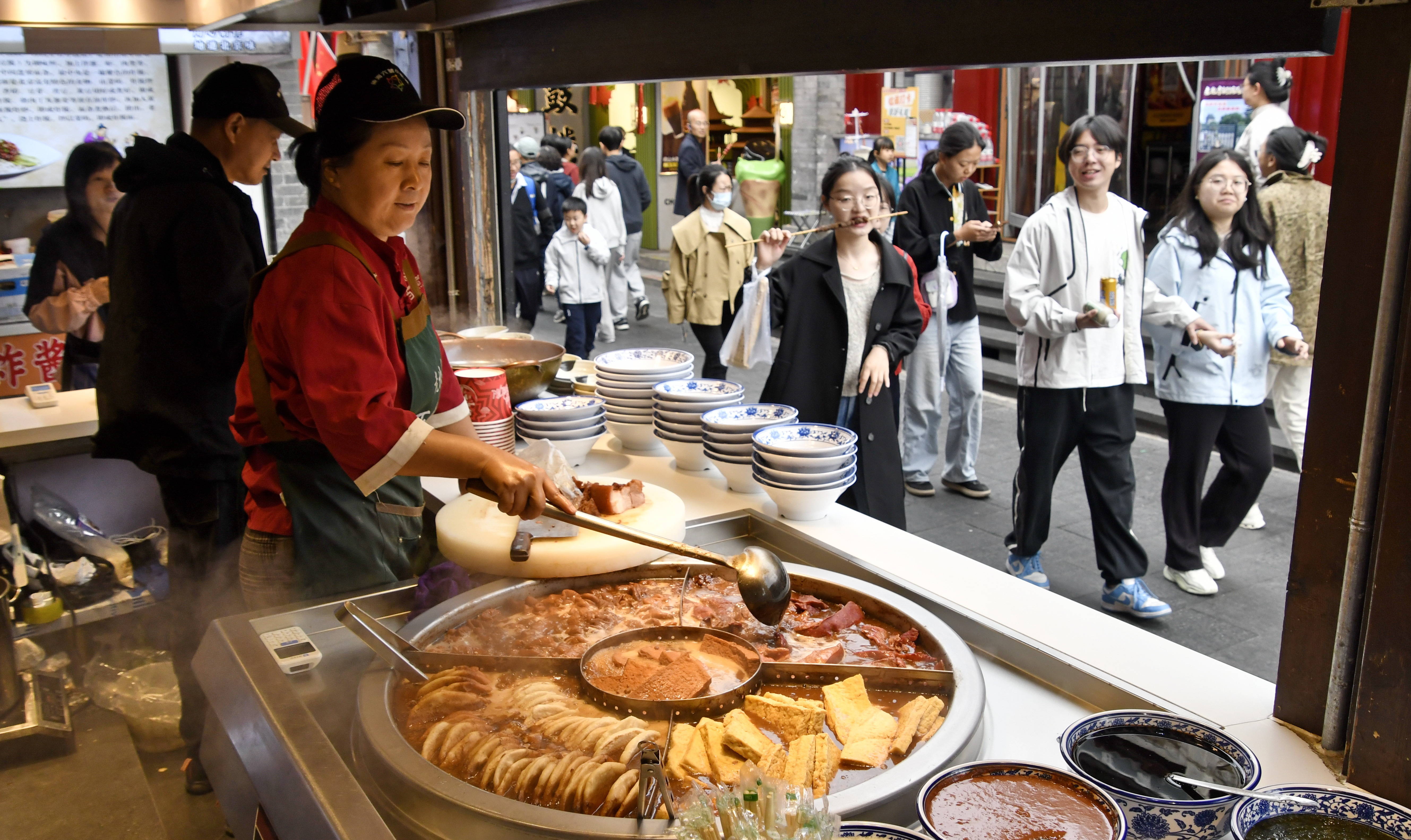 10月6日,游客在北京烟袋斜街品尝美食。新华社记者 李欣 摄普洱云璟国际花园酒店副总经理卢瑶表示,国庆假期,美团旅行带来的异地游客环比增长近35%,其中“00后”年轻客源占比上涨近65%。
